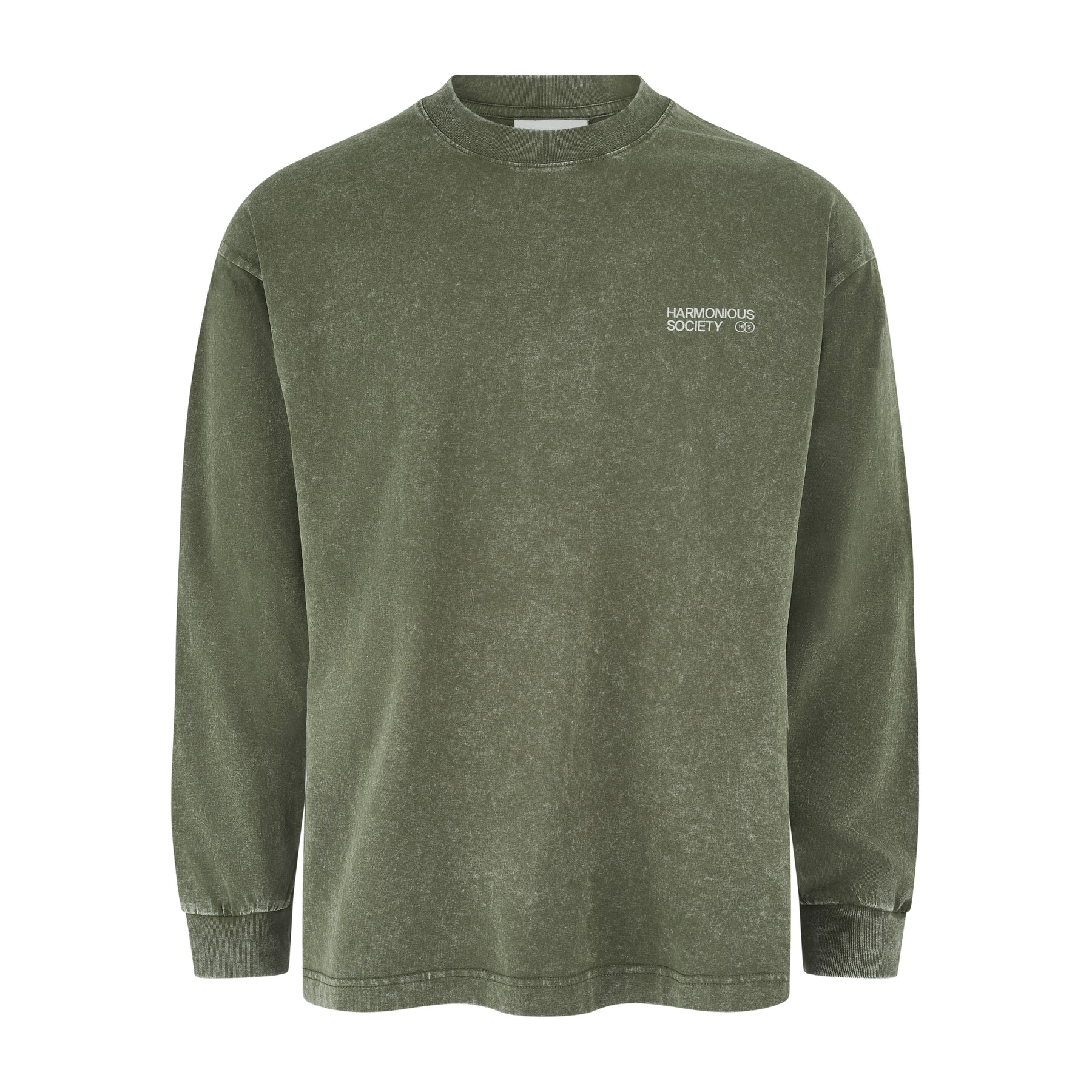 The Harmonious Core long sleeve T-shirt in washed army green is crafted with 100% supersoft organic cotton. It has an oversized silhouette in 235GSM. It features off white Harmonious core branding printed on the left chest and large on the rear.