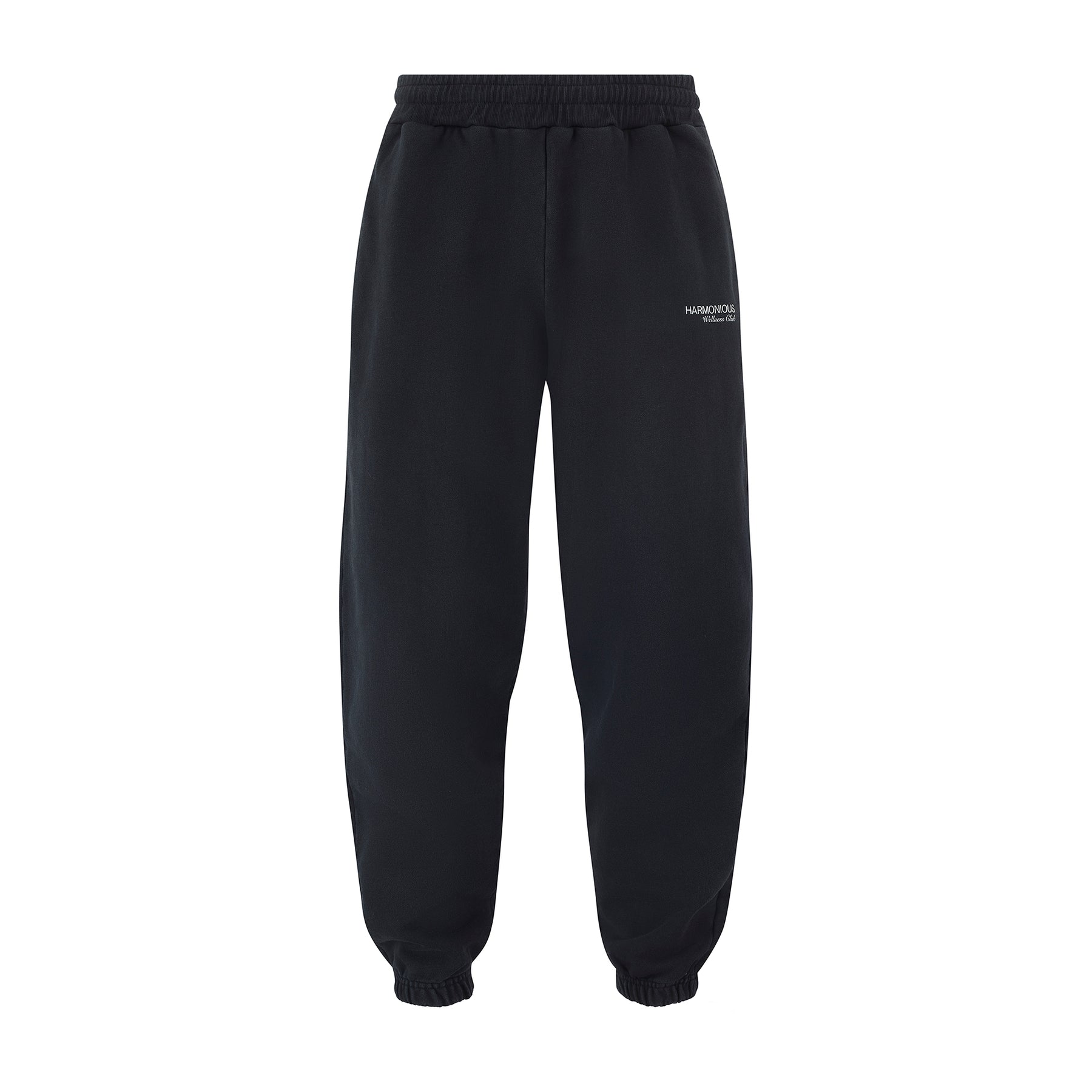 Relaxed sweatpants in black with Harmonious Wellness Club mark at the front. Elasticated waistband and cuffs with a clean straight leg. Built for people who move with intention.